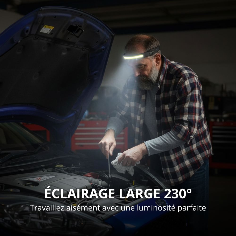 Avec la lampe frontale LED 230°, vous voyez tout votre espace d’un seul coup d’œil — plus d’ombres, plus de zones cachées, plus besoin de vous tordre le cou pour y voir clair.
